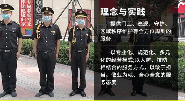 公司坚持"创新发展、优化管理、坚守责任、品牌服务”的服务宗旨。以“讲文明、懂礼节、树形象、强素质、爱岗位、尽责任"的服务理念;以专业化、规范化、多元化的经营模式;以人防、技防相结合的服务方式,以敢于担当、敬业为魂、全心全意的服务态度。针对每一个护卫目标,设计上佳的安保服务方案,为客户营造安全、稳定的工作环境。